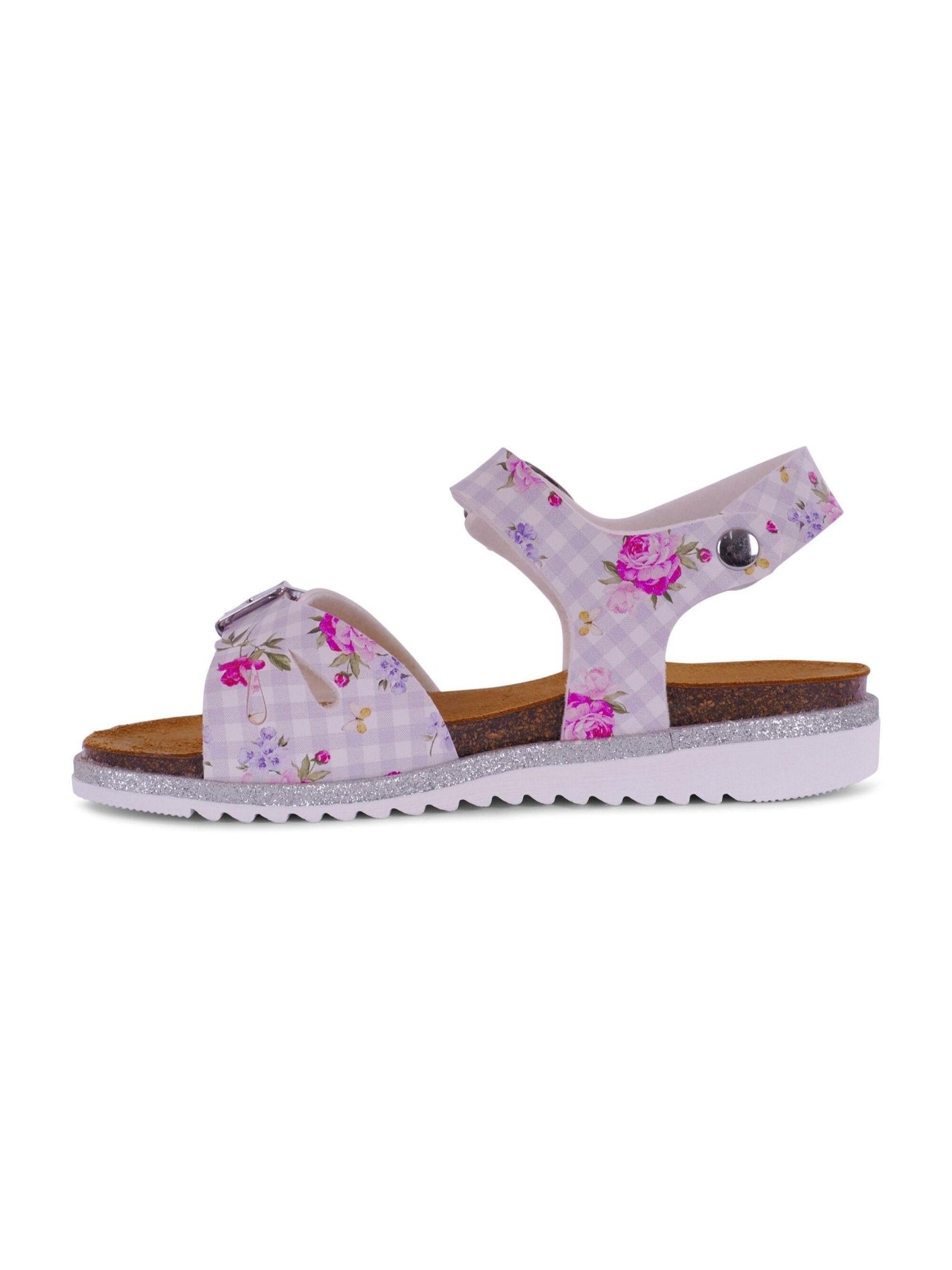 The Monnalisa girls' white and purple floral print sandals are available on the RubinoKids.com online store. Made of 100% polyurethane, they feature a white and purple floral print, a checked pattern, a buckle closure, sequin details, and a platform sole. Available in various sizes, they are part of the Monnalisa Spring/Summer 2026 collection and are available for 24-48 hour delivery in Italy.