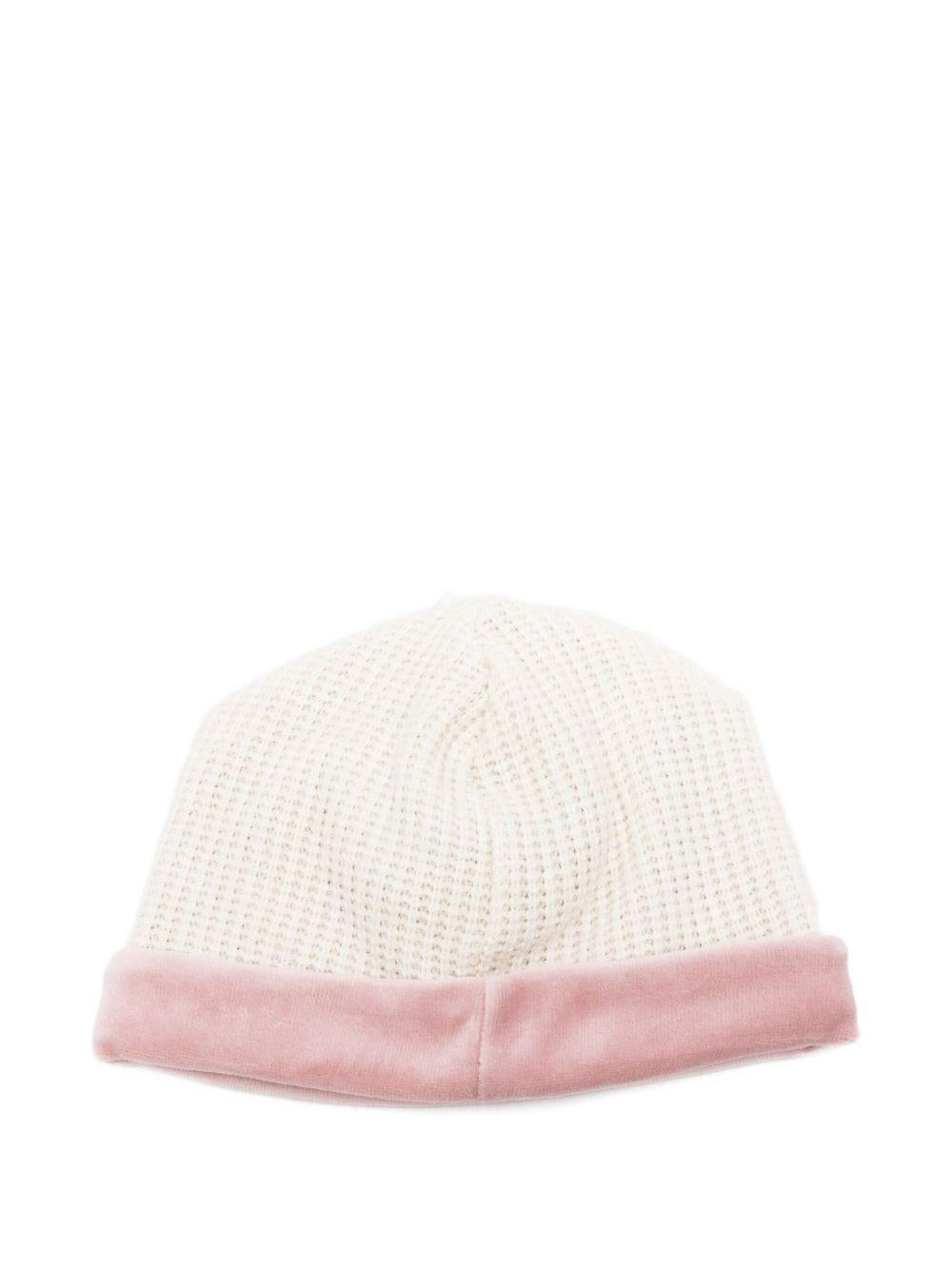 The La Stupenderia baby girl's white hat with pink decoration is available on the RubinoKids.com online store. Made of 100% fabric, it features a white pull-on style with a folded visor and pink decoration, and a waffle knit. Available in various sizes, it is part of the La Stupenderia Fall/Winter 2025 collection and is available for 24-48 hour delivery in Italy.