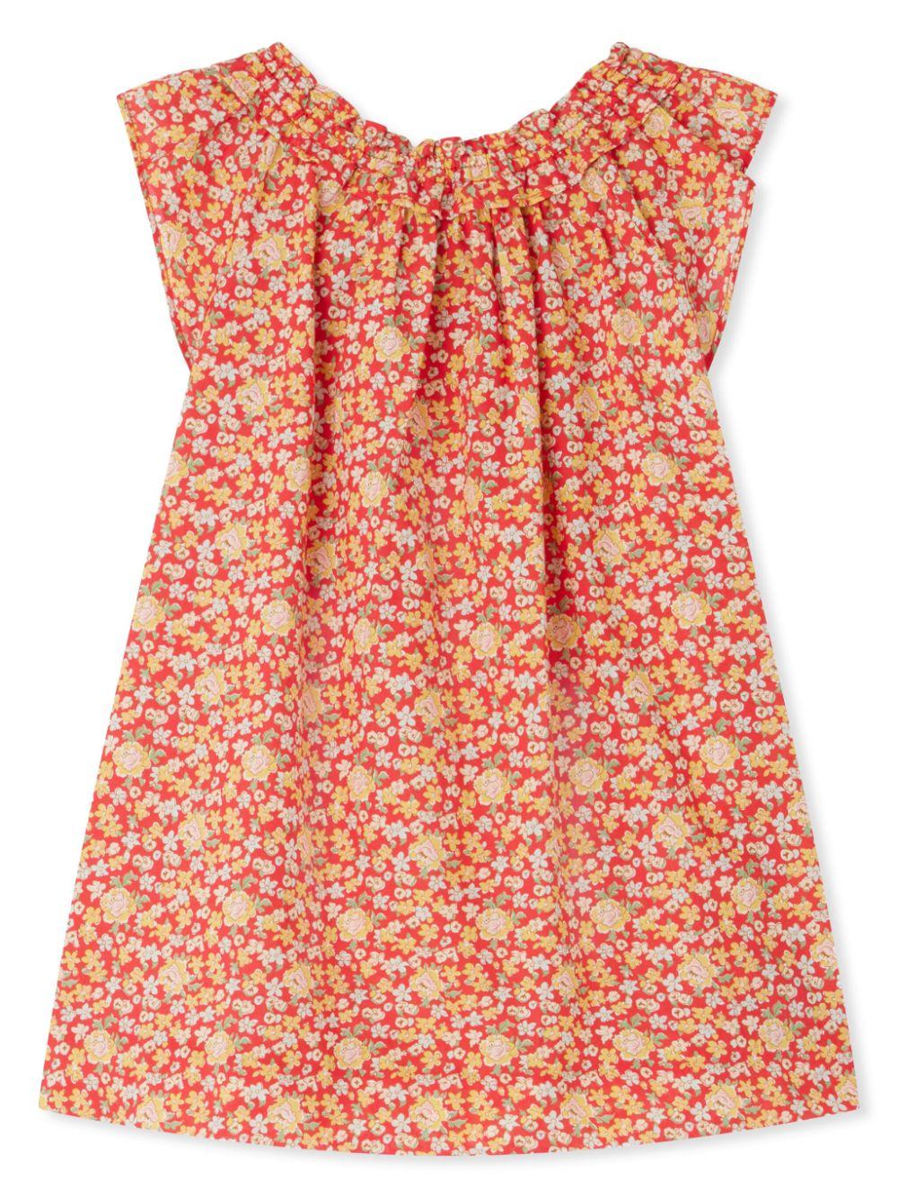 The Bonpoint red gold dress for girls with cap sleeves is available on the RubinoKids.com online store. Made of 100% cotton, it features cap sleeves, a ruffle collar, and a cardinal red floral print with an elastic waistband. This size is from the Bonpoint Spring/Summer 2025 collection and is available for immediate shipment with delivery within 24-48 hours in Italy.