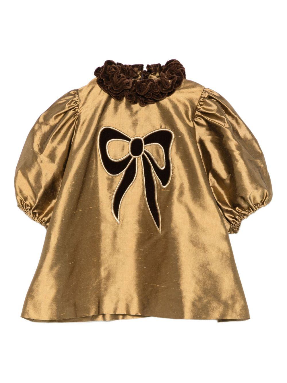 Jesurum gold ruffled baby girl dress with embroidered bow