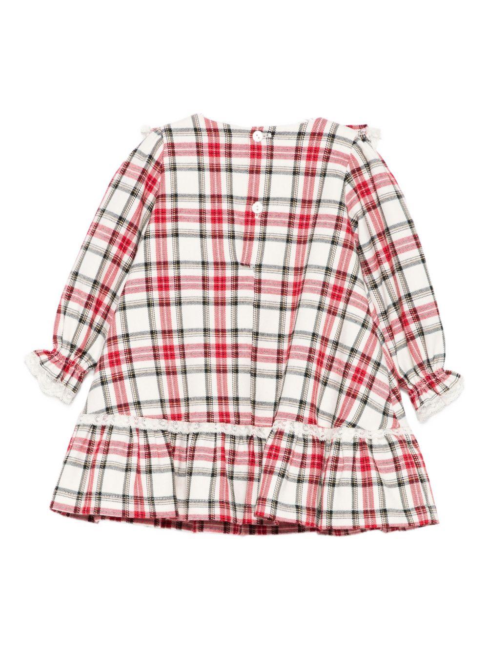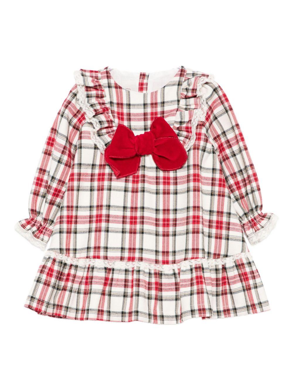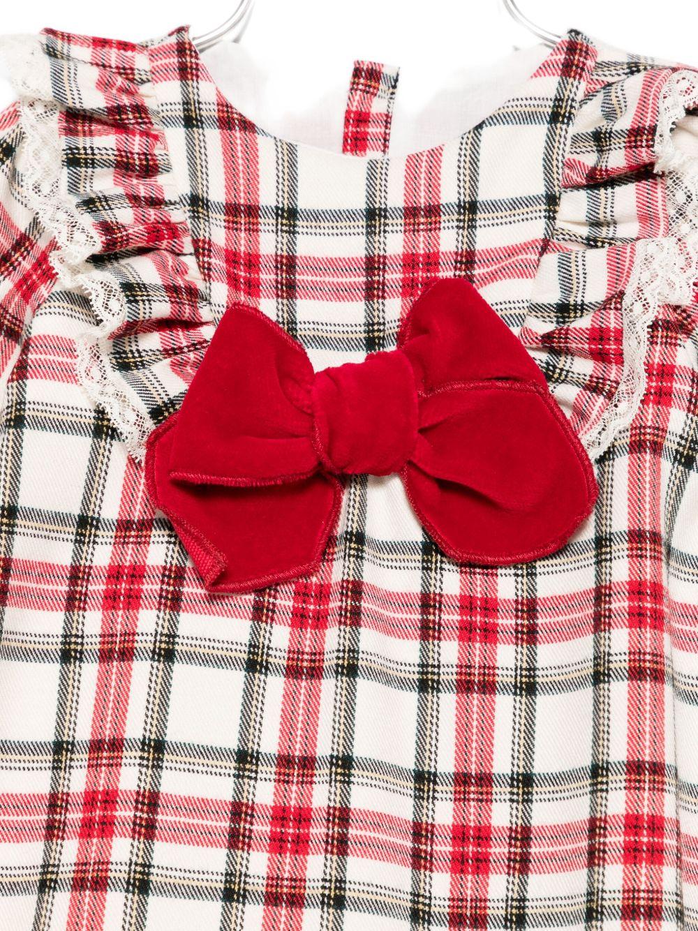 The La Stupenderia baby girl's red checked dress is available on the RubinoKids.com online store. Made of 63% polyester, 34% viscose, and 3% elastane, it features a red check pattern, a velvet bow, lace trim, long sleeves, and a gathered hem. Available in various sizes, it is part of the La Stupenderia Fall/Winter 2025 collection and is available for 24-48 hour delivery in Italy.