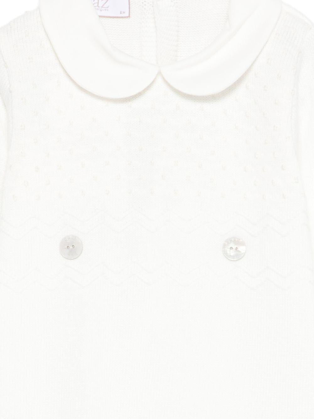 The Paz Rodriguez white knitted baby onesie is available on the RubinoKids.com online store. Made of 100% cotton, it is white, knitted, and features a Peter Pan collar. Available in various sizes, it is part of the Paz Rodriguez 24/48h collection for Italy.