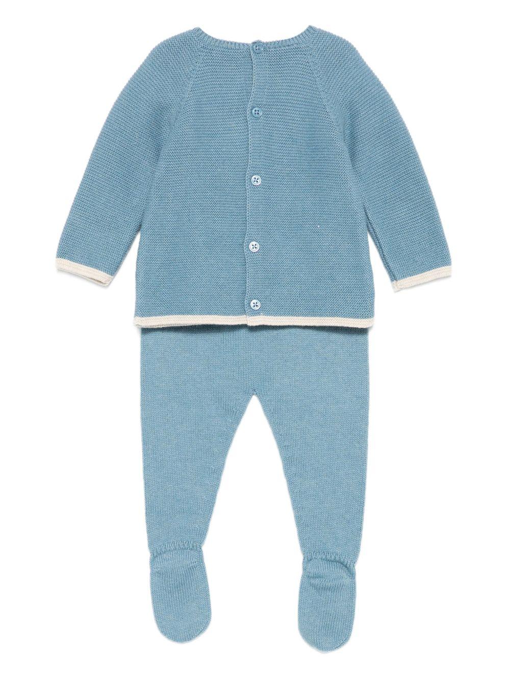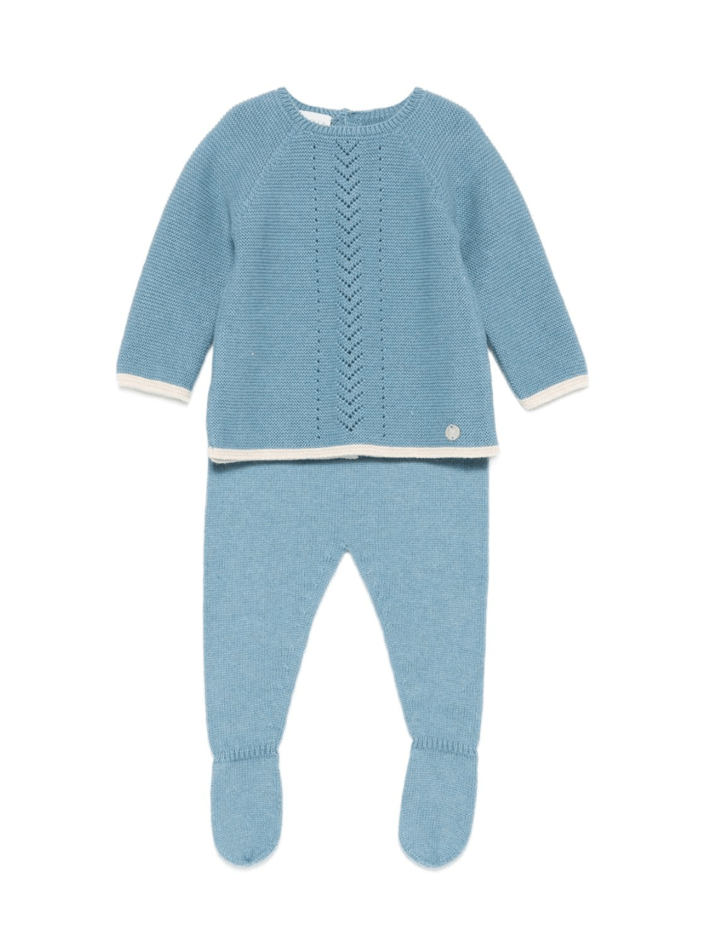 The Paz Rodriguez baby onesie in blue with a textured pattern is available on the RubinoKids.com online store. Made from 95% cotton and 5% cashmere, it features a blue color, ribbed cuffs, a knit fabric, a textured pattern, a feet design, and an elastic waistband. Available in various sizes, it is part of the Paz Rodriguez Fall/Winter 2025 collection and is available for immediate shipment with delivery within 24-48 hours in Italy.