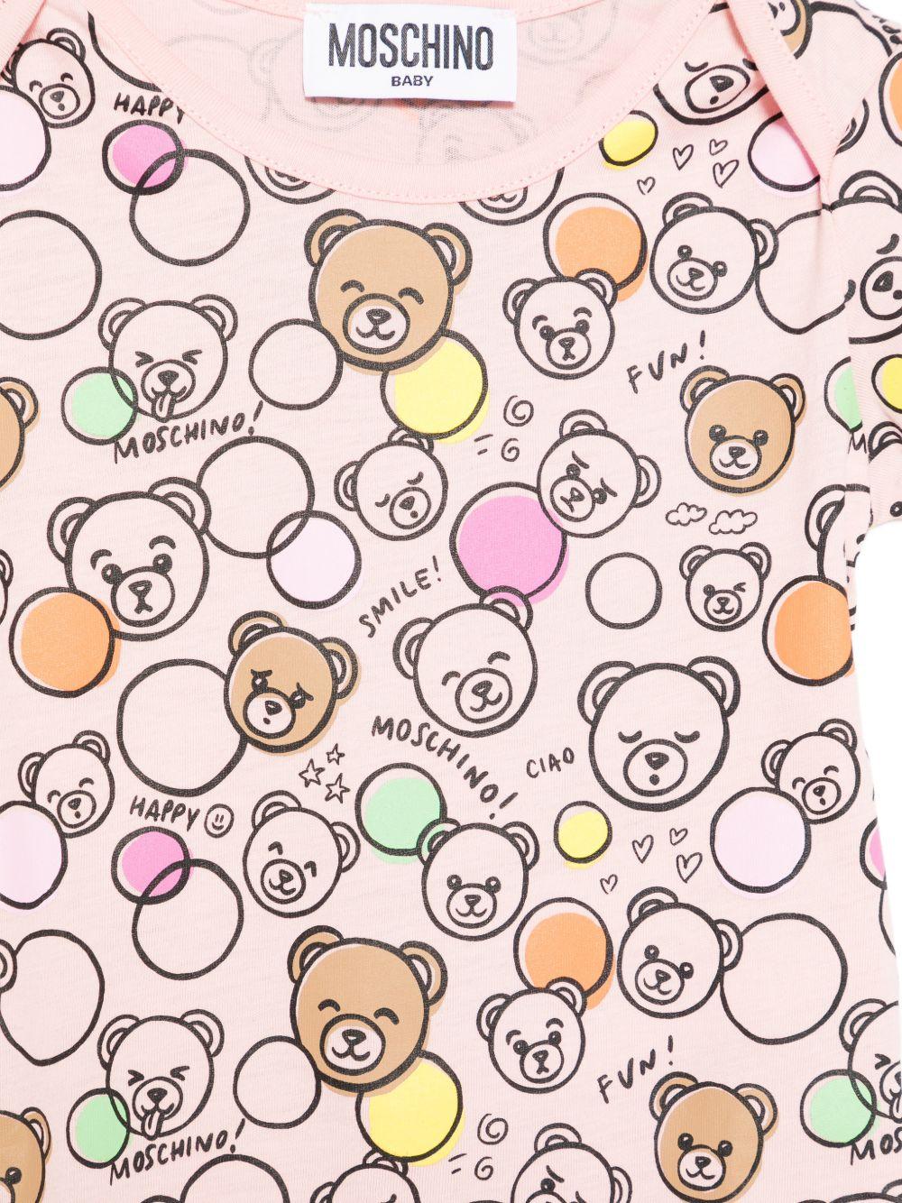 The Moschino Kids pink baby girl's bodysuit with an all-over print is available on the RubinoKids.com online store. Made of 100% cotton, it features a pink teddy bear print, a crew neck, short sleeves, and a snap button closure. Available in various sizes, it is part of the Moschino Kids Spring/Summer 2026 collection and is available for immediate shipment with delivery within 24-48 hours in Italy.