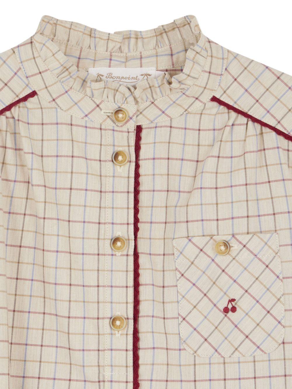 The Bonpoint beige dress with ruffles for girls is available on the RubinoKids.com online store. Made of 100% cotton, it features a beige color, a checked pattern, a ruffled collar, a button closure, a tie belt, and embroidered cherry details. Available in various sizes, it is part of the Bonpoint Fall/Winter 2025 collection and is available for immediate shipment with delivery within 24-48 hours in Italy.