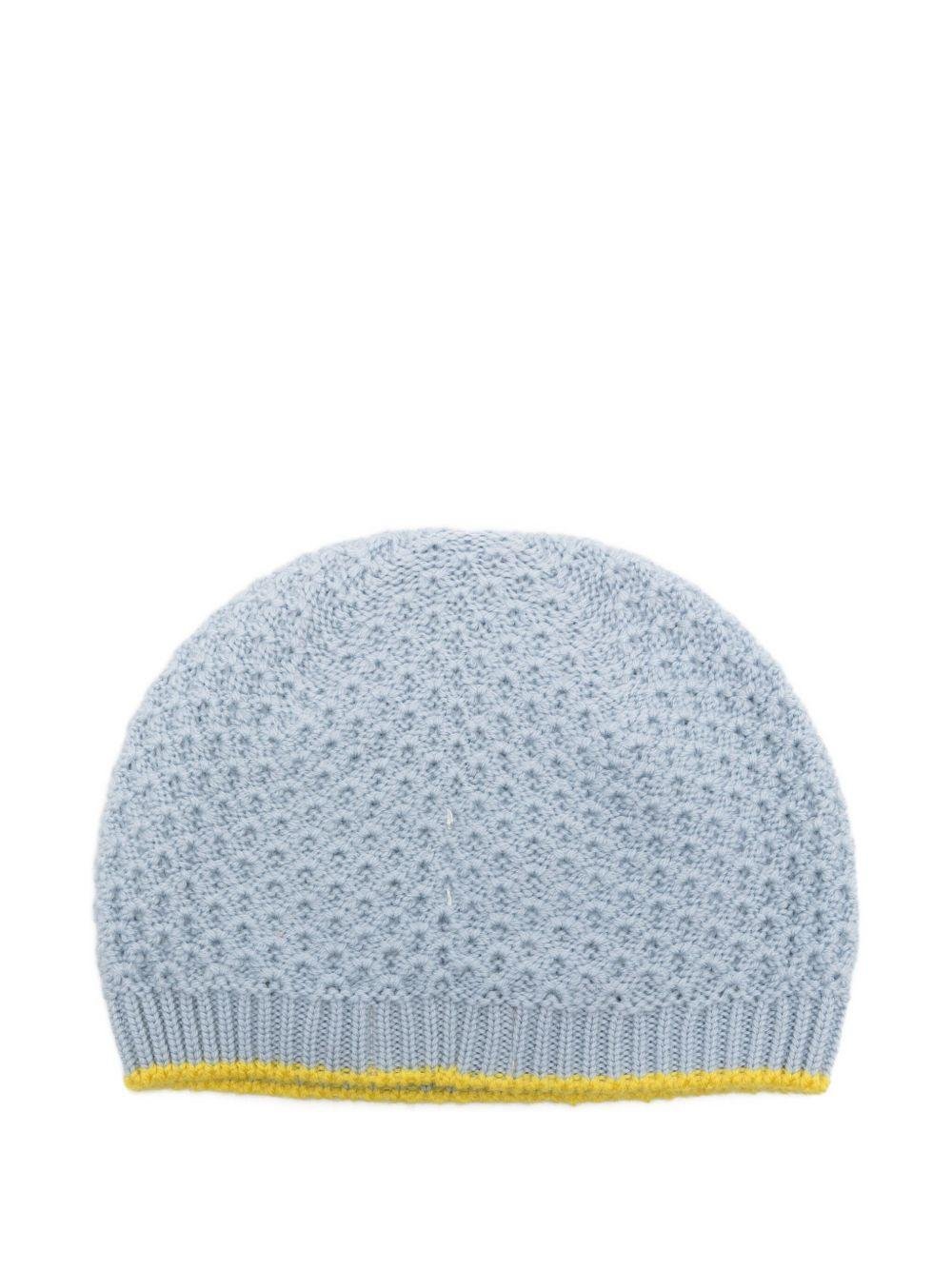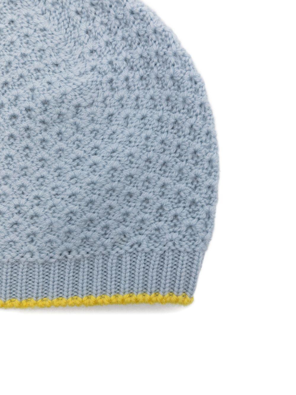 The Gensami Kids baby hat in light blue with fitted edges is available on the RubinoKids.com online store. Made of 100% wool, it features a light blue color, a textured knit, yellow edges, a fitted fit, and a ribbed hem. Available in various sizes, it is part of the Gensami Kids Fall/Winter 2025 collection and is available for 24-48 hour delivery in Italy.