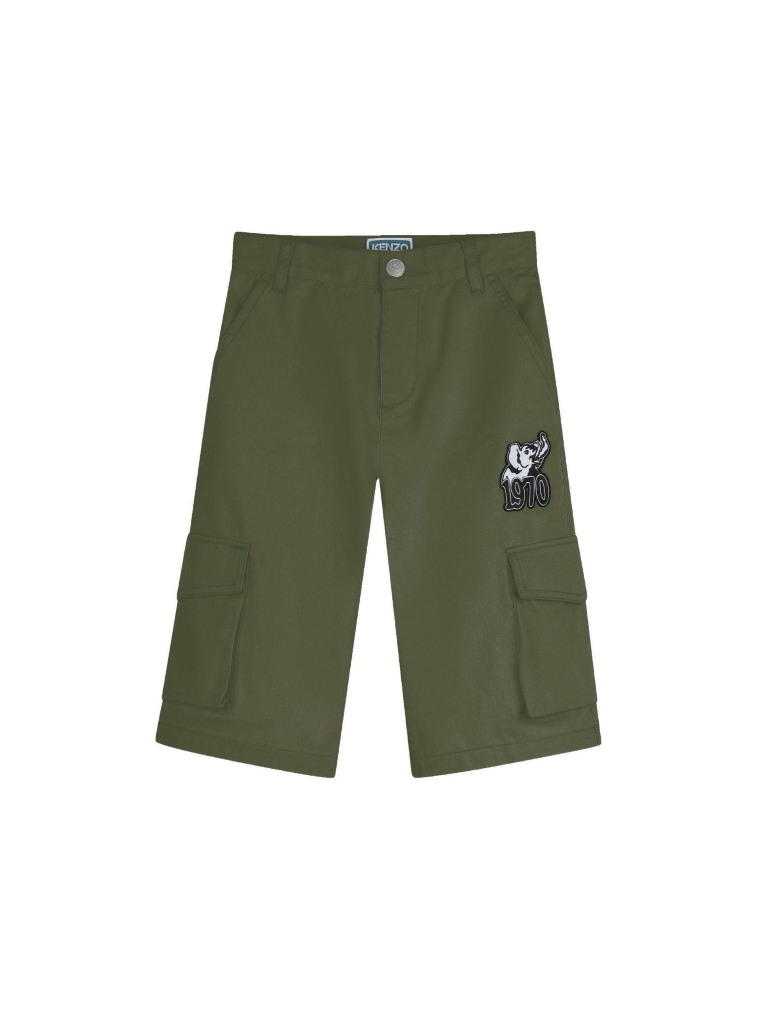 The Kenzo Kids green cargo shorts for boys with applique are available on the RubinoKids.com online store. Made of 100% cotton, they feature a green color, applique detail, side cargo pockets, belt loops, a logo on the back, and two side pockets. Available in various sizes, they are part of the Kenzo Kids Spring/Summer 2026 collection and are available for 24-48 hour delivery in Italy.