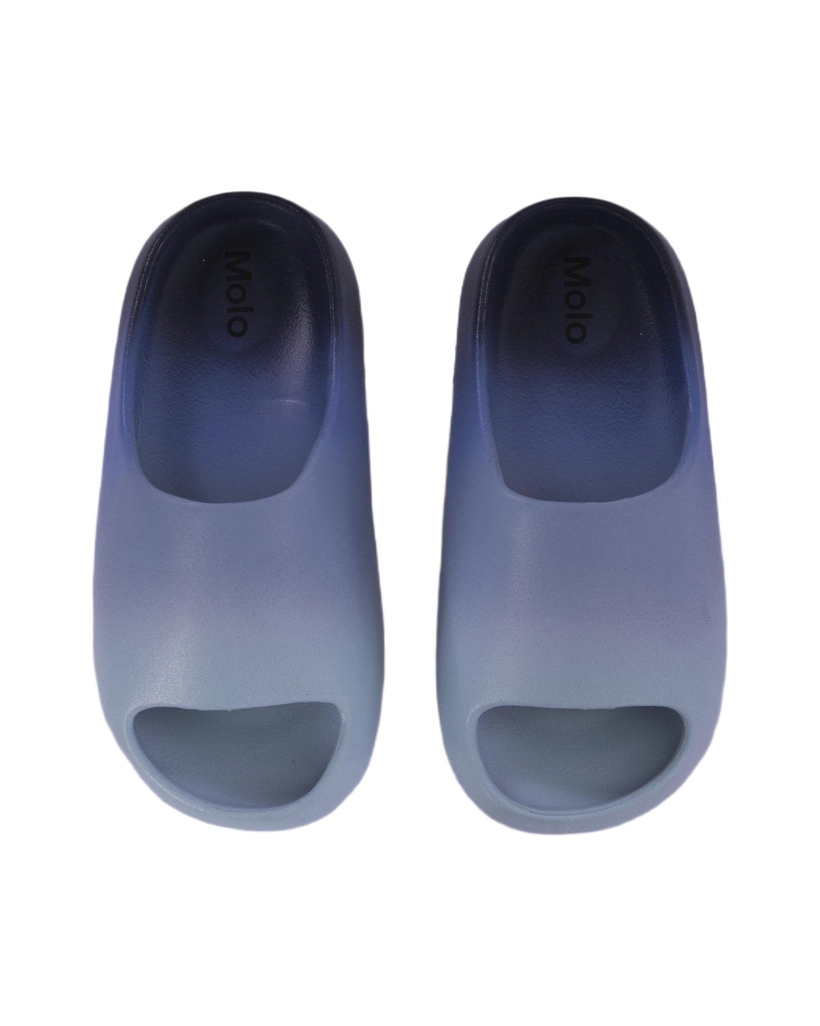 The Molo Zion boys' slippers in light blue with a gradient effect are available on the RubinoKids.com online store. Made of 100% polyvinyl butyral (synthetic material), they feature a light blue color, a gradient effect, an open toe, and a slip-on design. Available in various sizes, they are part of the Molo Spring/Summer 2026 collection and are available for immediate shipment with delivery within 24-48 hours in Italy.