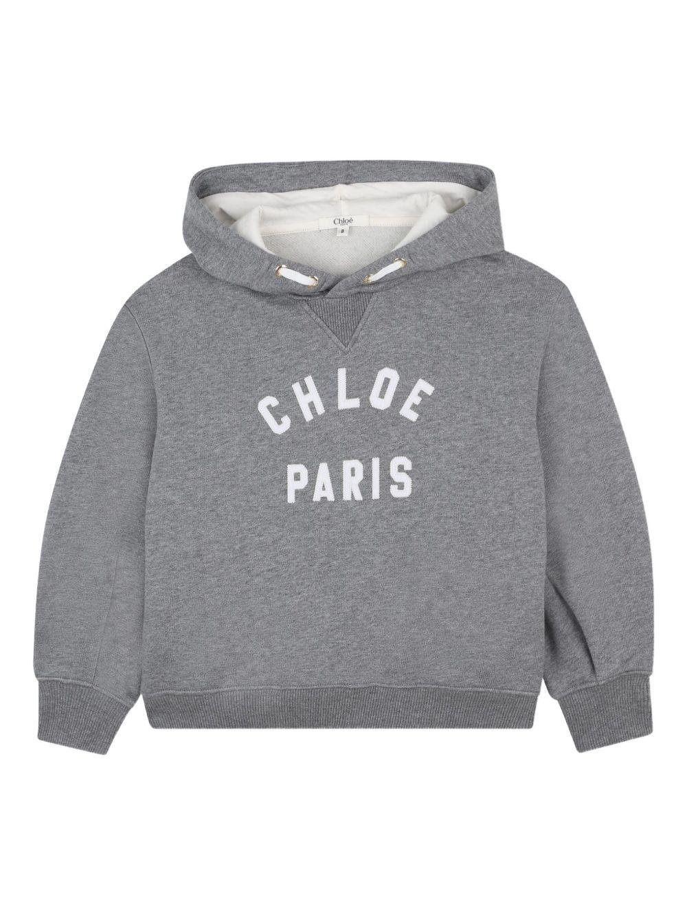 The Chloé Kids gray sweatshirt for girls with logo print is available on the RubinoKids.com online store. Made of 100% cotton, it features a gray color, logo print, drawstring hood, ribbed hem, and long sleeves. Available in various sizes, it is part of the Chloé Kids Fall/Winter 2025 collection and is available for delivery in Italy within 24-48 hours.