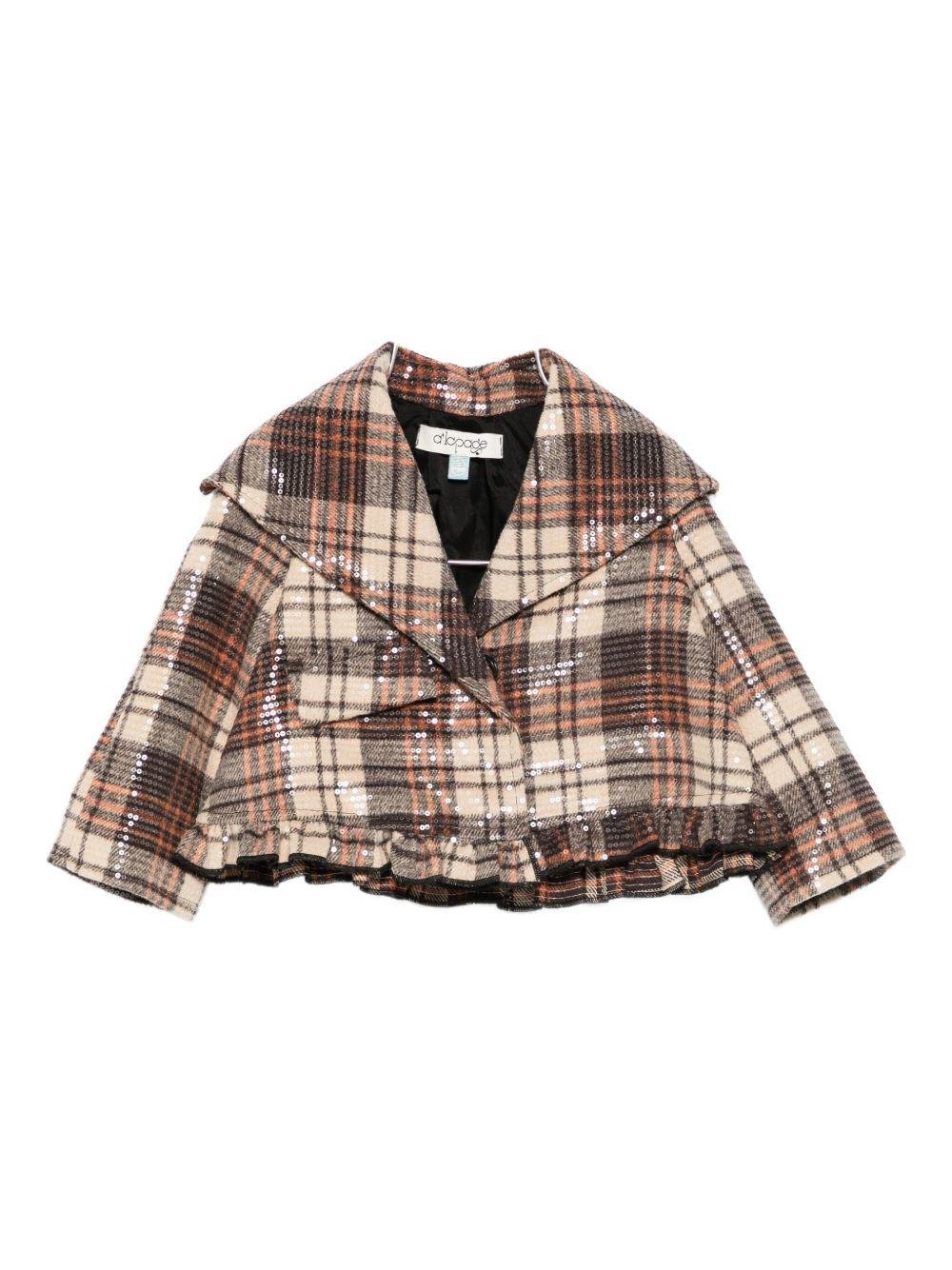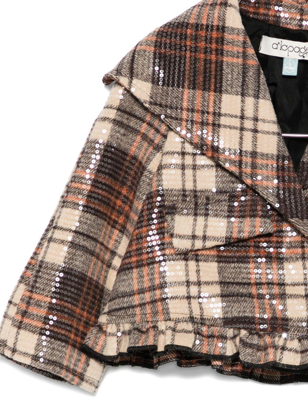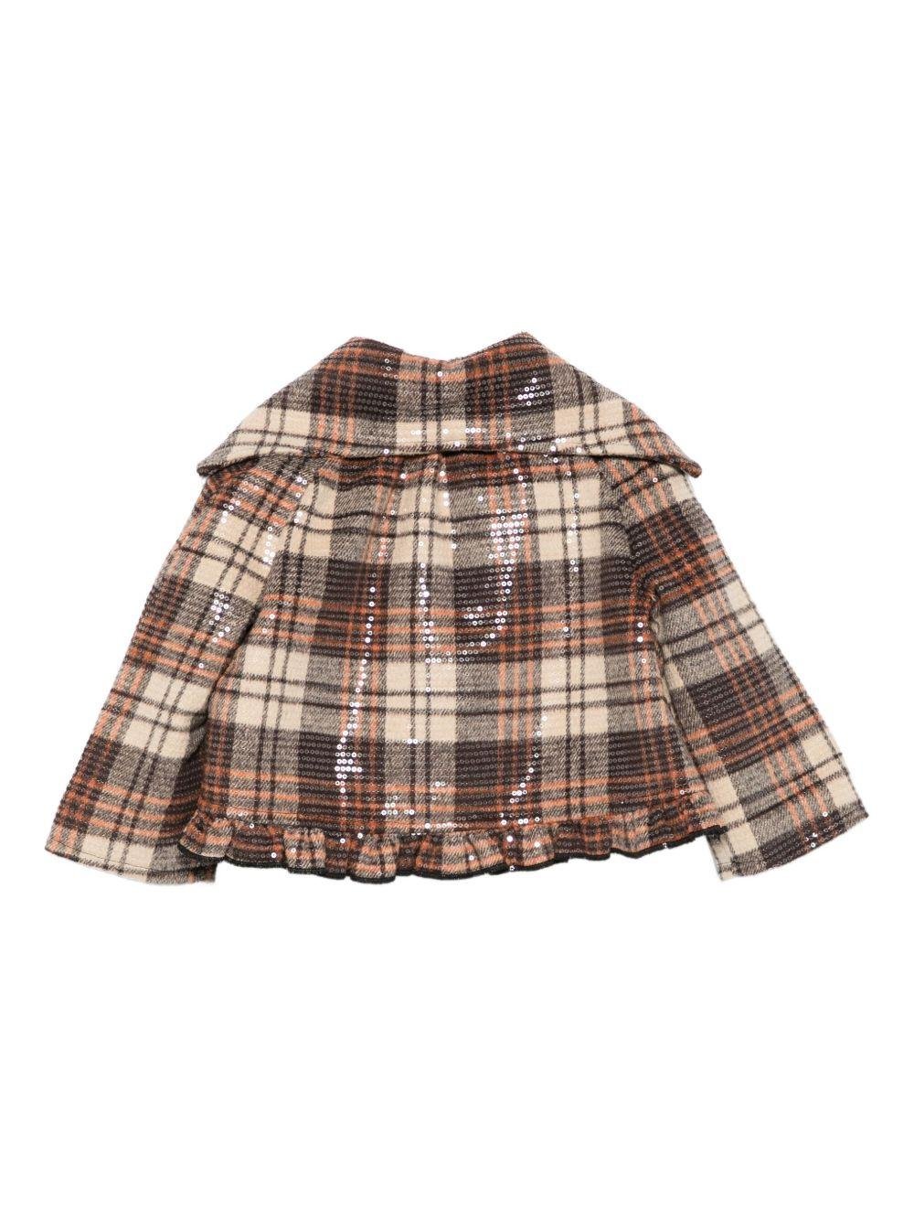 The A'lapage multicolored checked jacket for newborns is available on the RubinoKids.com online store. Made of 100% fabric, it features a brown/beige color, a checked pattern, sequin embellishments, a gathered hem, and wide lapels. Available in various sizes, it is part of the A'lapage Fall/Winter 2025 collection and is available for 24-48 hour delivery in Italy.