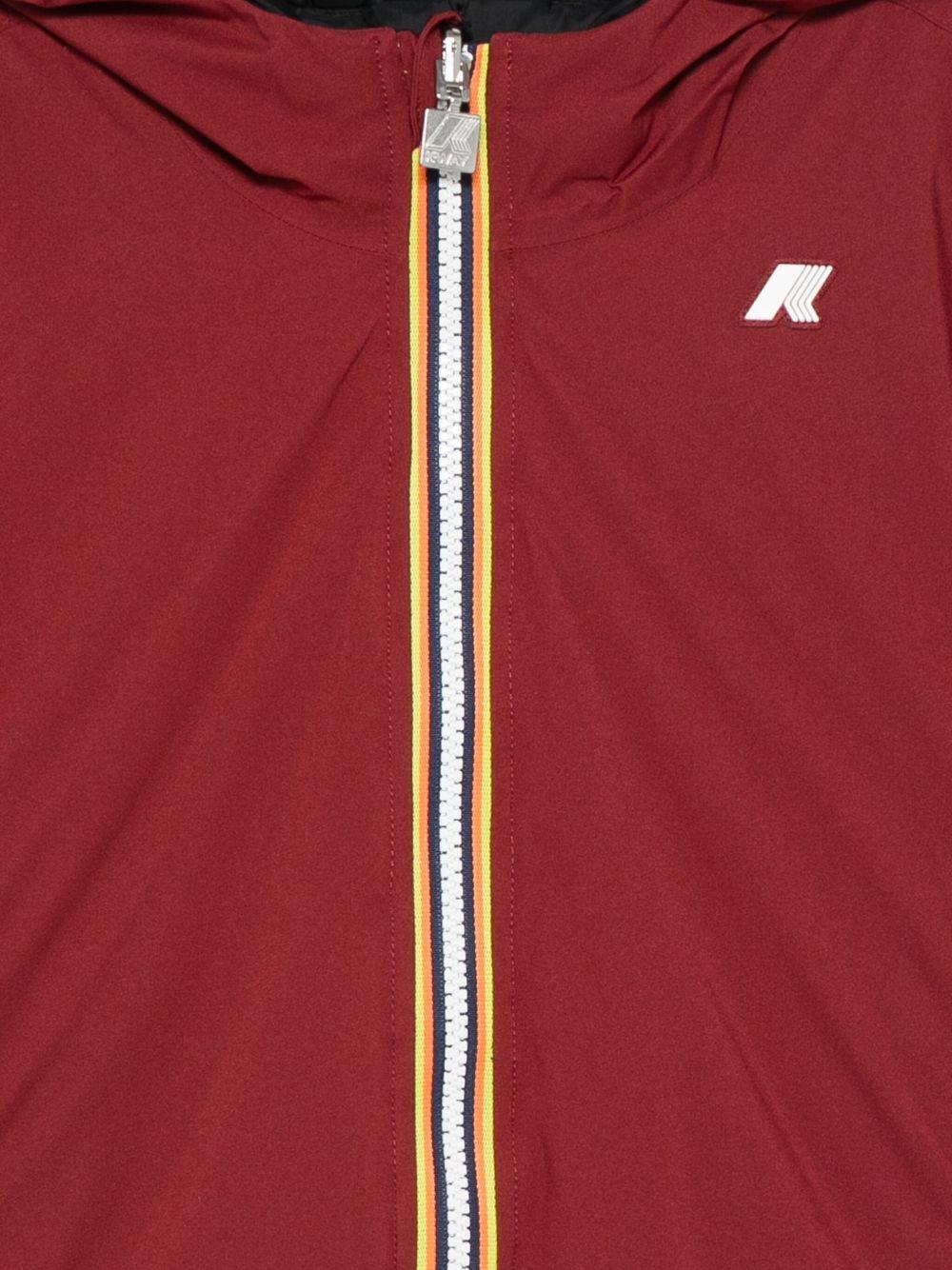 The red K-Way Kids jacket with logo patch is available on the RubinoKids.com online store. Made of 100% polyester, it features a red color, a central zip closure, a multicolored striped zip, a classic hood, a logo patch, and long sleeves. Available in various sizes, it is part of the K-Way Kids Fall/Winter 2025 collection and is available for 24-48 hour delivery in Italy.