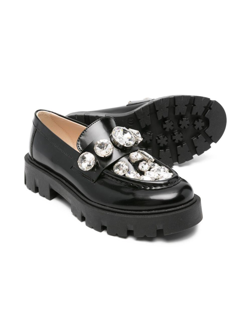 The Florens black moccasins for girls with crystal decorations are available on the RubinoKids.com online store. Made of 100% leather, they feature a black color, crystal decorations, a slip-on style, a round toe, and a rubber sole. Available in various sizes, they are part of the Florens Fall/Winter 2025 collection and are available for immediate shipment with delivery within 24-48 hours in Italy.