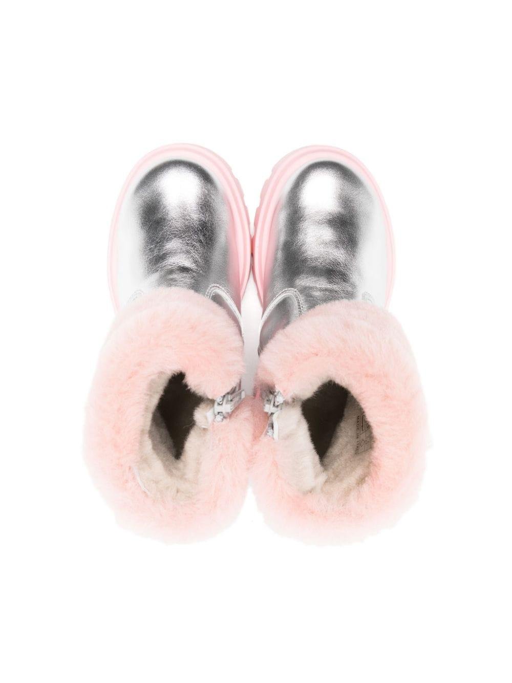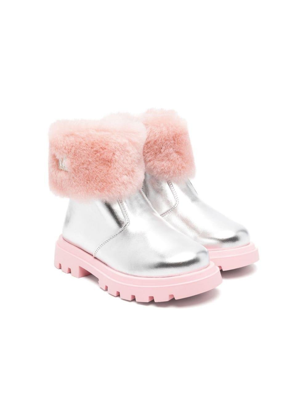 The Monnalisa silver laminated leather ankle boots for girls with a laminated finish are available on the online store RubinoKids.com. Lining: 100% goat fur. Sole: 100% elastodiene. Exterior: 100% goat fur, 100% calfskin. The ankle boots feature silver/bubblegum pink calfskin, a laminated finish, fur details, a silver-tone logo plaque, a round toe, a side zip fastening, a branded leather insole, a contrasting lug sole, a fur lining, and an ankle length. Available in various sizes, they are part of the Monnalisa Fall/Winter 2024 collection and are available for immediate shipment with delivery within 24-48 hours in Italy.