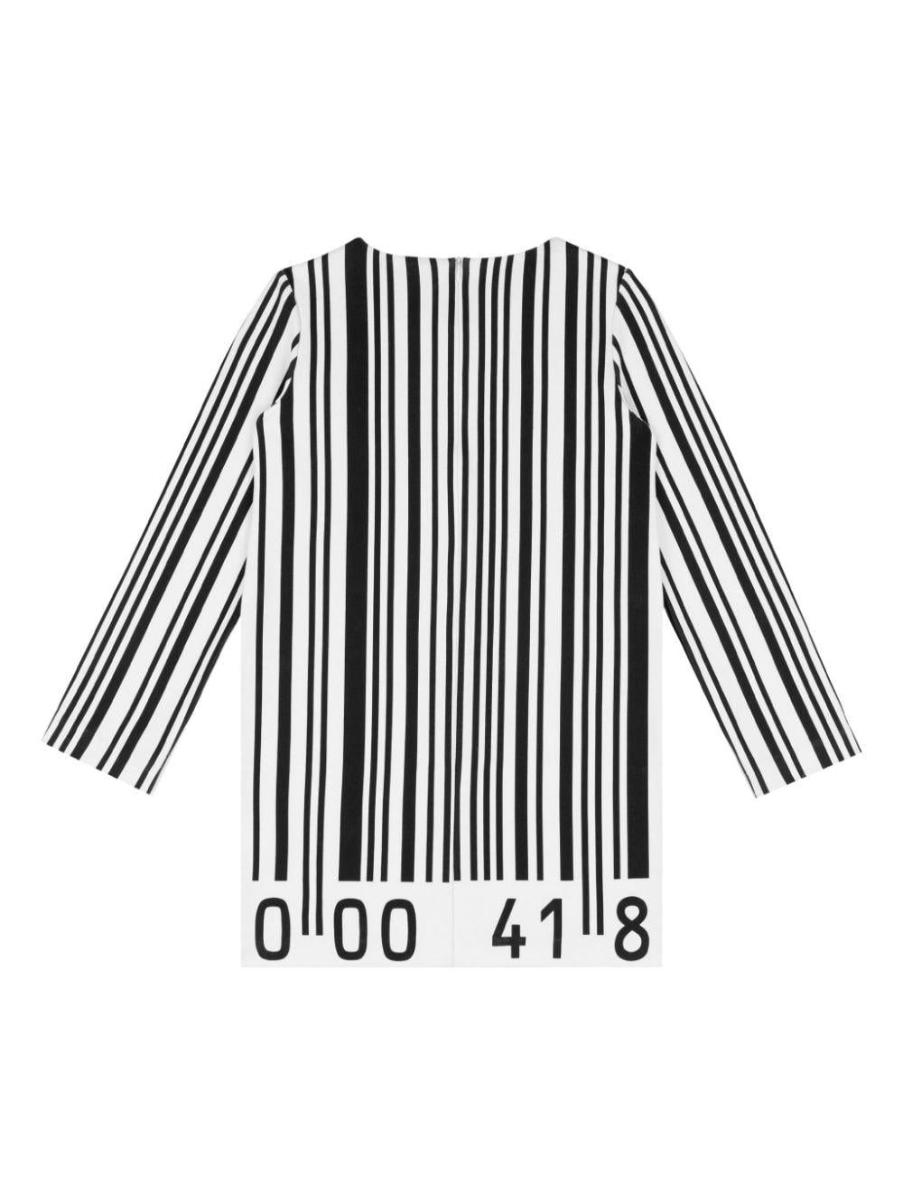 The Moschino Kids white brocade print dress for girls with a crew neck is available on the RubinoKids.com online store. Made of 66% viscose, 29% polyamide, and 5% elastane, it features a barcode print, a crew neck, a logo print on the hem, long sleeves, and a straight hem. This size is part of the Moschino Kids Fall/Winter 2024 collection and is available for immediate shipment with delivery within 24-48 hours in Italy.