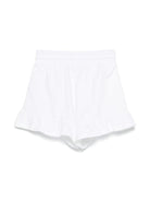 The Moschino Kids white Leo Teddy print shorts for girls with two side pockets are available on the RubinoKids.com online store. Made from 100% cotton, they feature an elasticated drawstring waist, two side pockets, and a ruffle trim. This size is part of the Moschino Kids Spring/Summer 2025 collection and is available for immediate shipment with delivery within 24-48 hours in Italy.