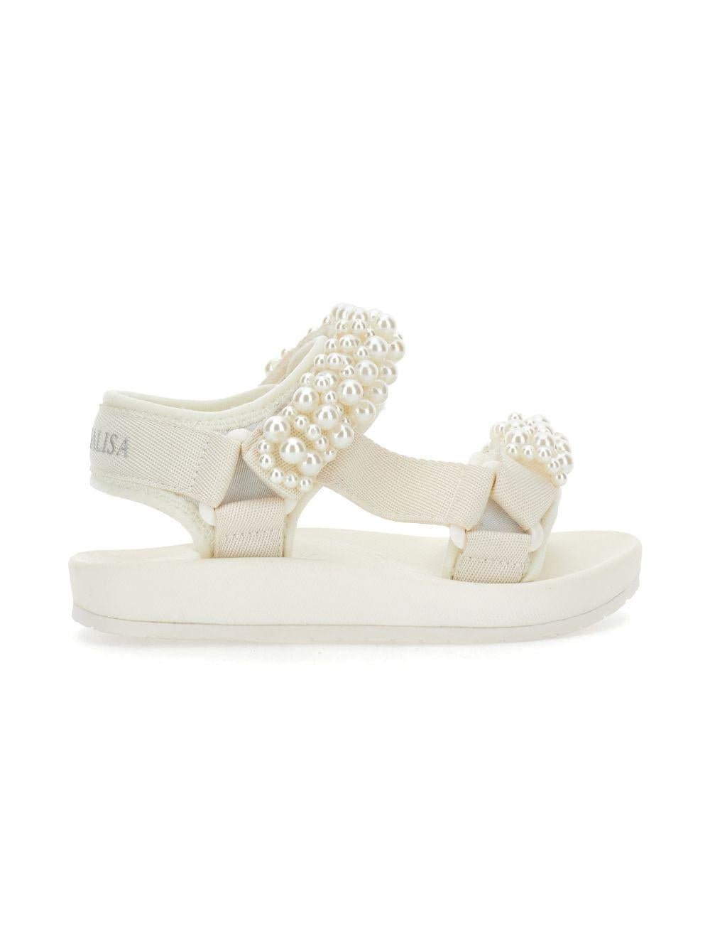 The Monnalisa white sandals for girls with beaded appliqués are available on the RubinoKids.com online store. Made of 100% polyamide, they feature a white color, pearl embellishment, a strap, a velcro closure, a platform, and a logo detail. Available in various sizes, they are part of the Monnalisa Spring/Summer 2026 collection and are available for 24-48 hour delivery in Italy.