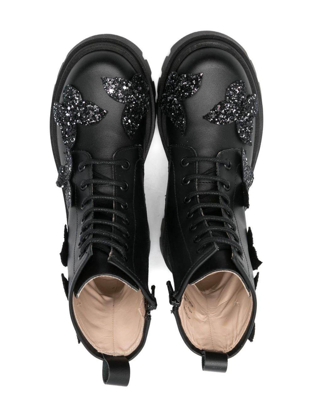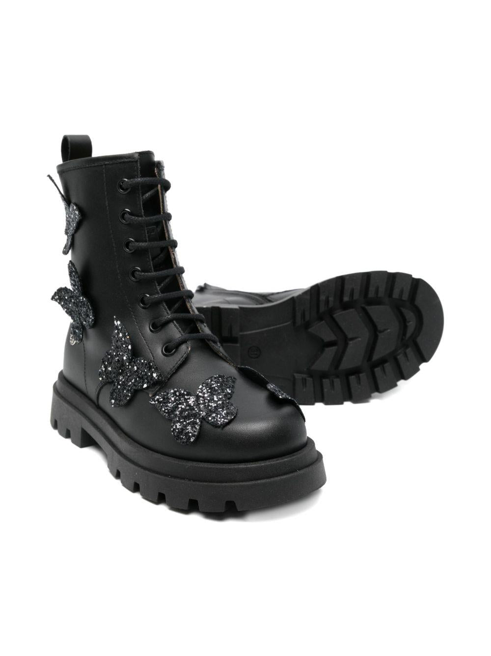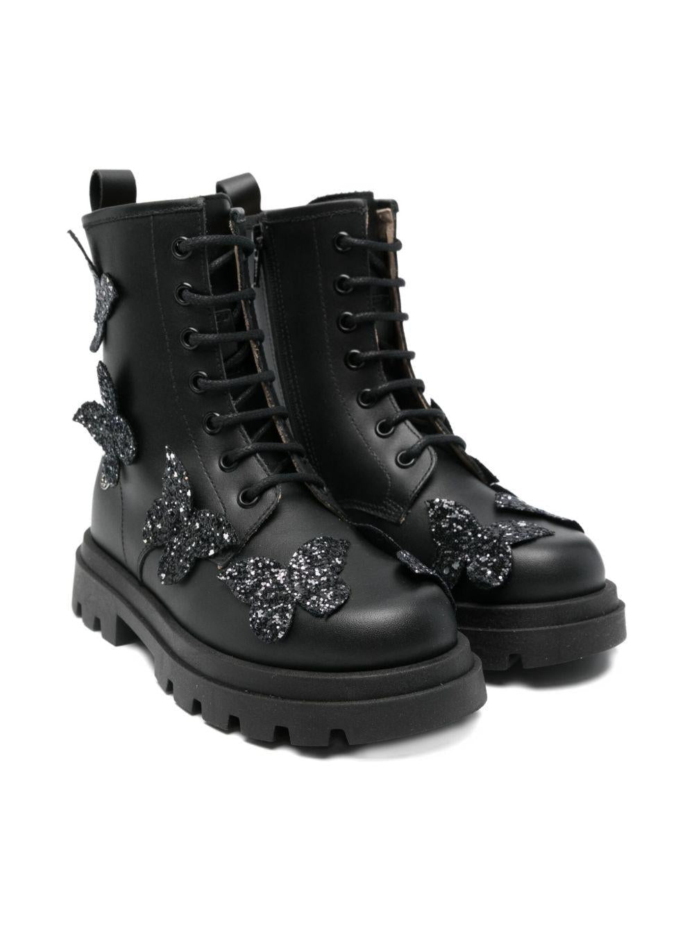 The Florens black boots for girls with butterfly appliques are available on the RubinoKids.com online store. Made of 100% leather, they feature black leather, glittery butterfly appliques, a lace-up closure, a side zip, a round toe, and a thick sole. Available in various sizes, they are part of the Florens Fall/Winter 2025 collection and are available for 24-48 hour delivery in Italy.
