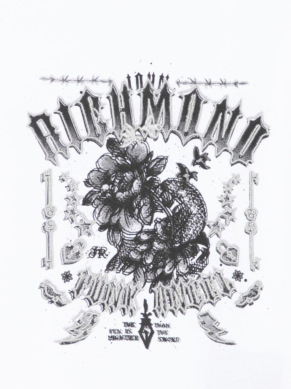 The John Richmond Junior white graphic print T-shirt for boys is available on the RubinoKids.com online store. Made of 100% cotton, it features a white color, short sleeves, a crew neck, and a straight hem. Available in various sizes, it is part of the John Richmond Junior Fall/Winter 2025 collection and is available for immediate shipment with delivery within 24-48 hours in Italy.