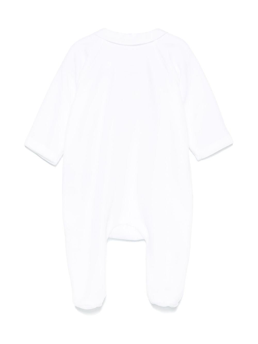 The Tartine Et Chocolat white embroidered baby girl pajamas are available on the RubinoKids.com online store. Made from 100% cotton, they are white, have a concealed snap front closure, a sock design, a logo collar, and long sleeves. Available in various sizes, they are part of the Tartine Et Chocolat Spring/Summer 2025 collection and are available for immediate shipment with delivery within 24-48 hours in Italy.