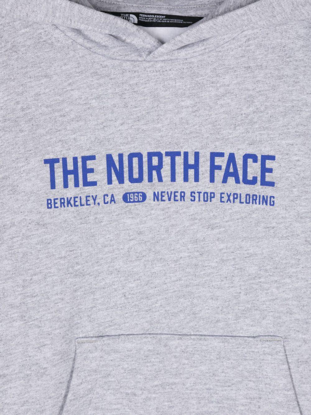 The North Face boys' gray hoodie with logo print is available on the RubinoKids.com online store. Made from 100% cotton, it features a gray cotton jersey fabric, a logo print on the front, a loose-fitting hood, long sleeves, a front kangaroo pocket, a logo print on the back, a fleece lining, and ribbed cuffs and hem. This size is part of the The North Face Kids Fall/Winter 2024 collection and is available for immediate shipment with delivery within 24-48 hours in Italy.