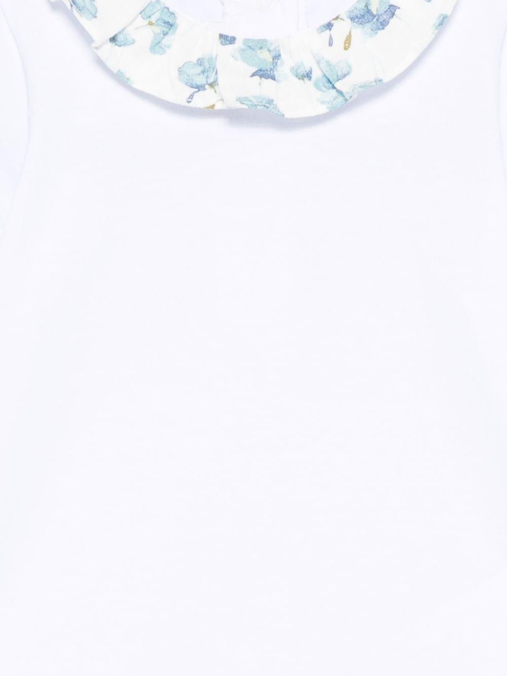 The Mariella Ferrari white baby girl's onesie with Peter Pan collar is available on the RubinoKids.com online store. Made of 100% cotton, it features a white Peter Pan collar, a collar with floral details, short sleeves, and a snap button closure. Available in various sizes, it is part of the Mariella Ferrari Spring/Summer 2026 collection and is available for 24-48 hour delivery in Italy.