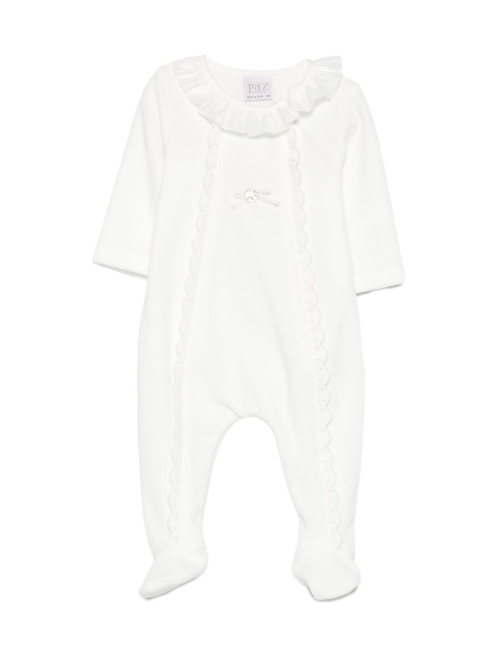 Il prodotto Tutina per neonati Paz Rodrìguez bianca con ruches è disponibile sullo store online RubinoKids.com. Realizzato in cotone 90%, poliestere 10%. Il prodotto presenta un colore bianco, colletto con ruches, finitura in pizzo, dettagli con bottoni, maniche lunghe, gambe con piedini. Varie taglie a catalogo, appartiene alla collezione Paz Rodríguez Autunno/Inverno 2025 ed è disponibile con consegna in 24/48h per l'Italia.